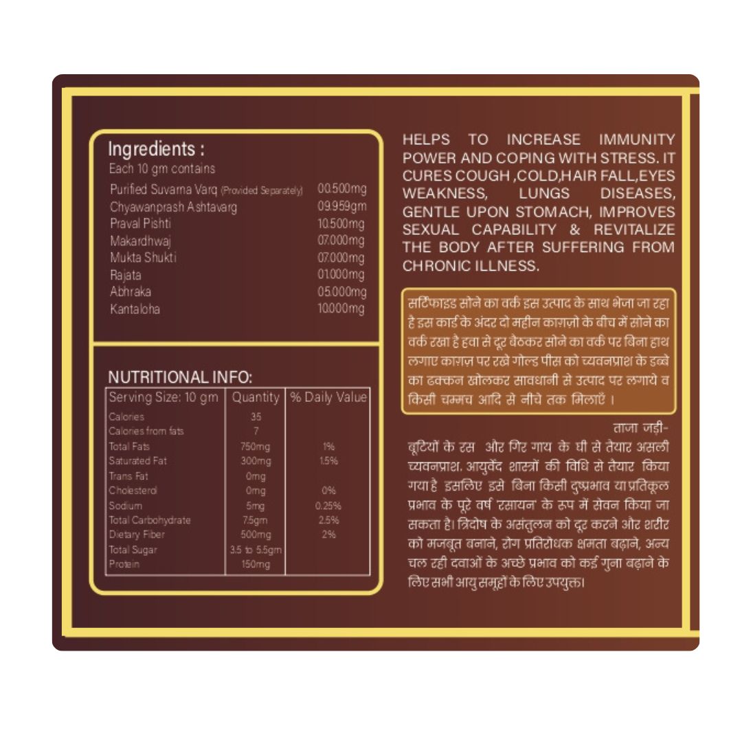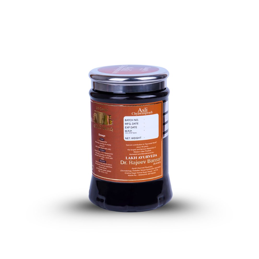 Asli Chyawanprash is a premium Ayurvedic formulation meticulously crafted with the finest ingredients, including Sarang Madhu – one of the world’s rarest honeys – and A2 Ghee. Enriched with the power of 24 Carat Gold Varq, Gold Bhasma, Silver Bhasma, Abhrak Bhasma, and Kesar, this unique blend strengthens immunity, revitalizes the body, and enhances overall well-being.