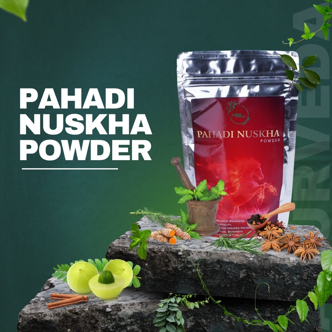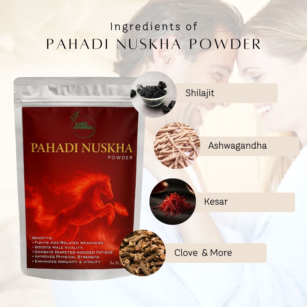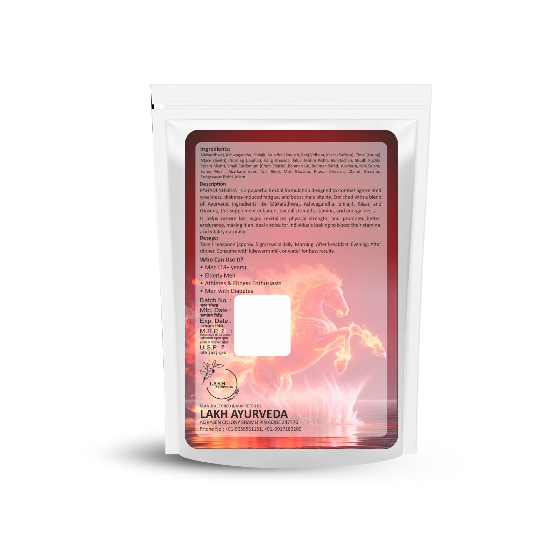 PAHADI NUSKHA is a powerful herbal formulation designed to combat age-related weakness, diabetes-induced fatigue, and boost male vitality. Enriched with a blend of Ayurvedic ingredients like Makaradhwaj, Ashwagandha, Shilajit and Kesar, this supplement enhances overall strength, stamina, and energy levels.